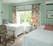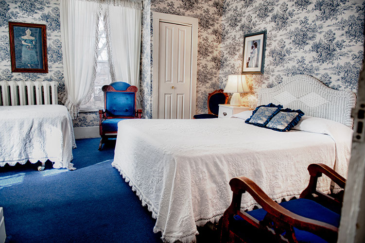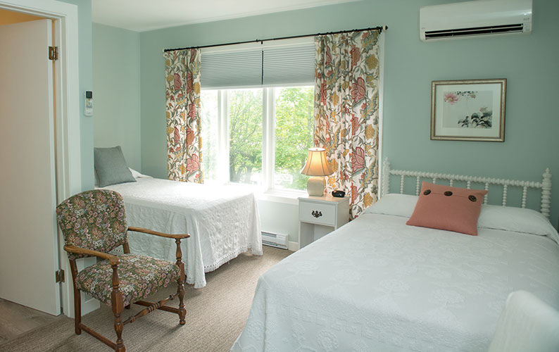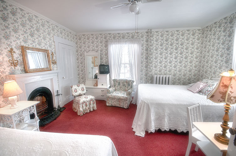 This Victorian style room is located in the main lodge, up one flight of stairs. It is beautifully decorated with two single beds and a private bath.